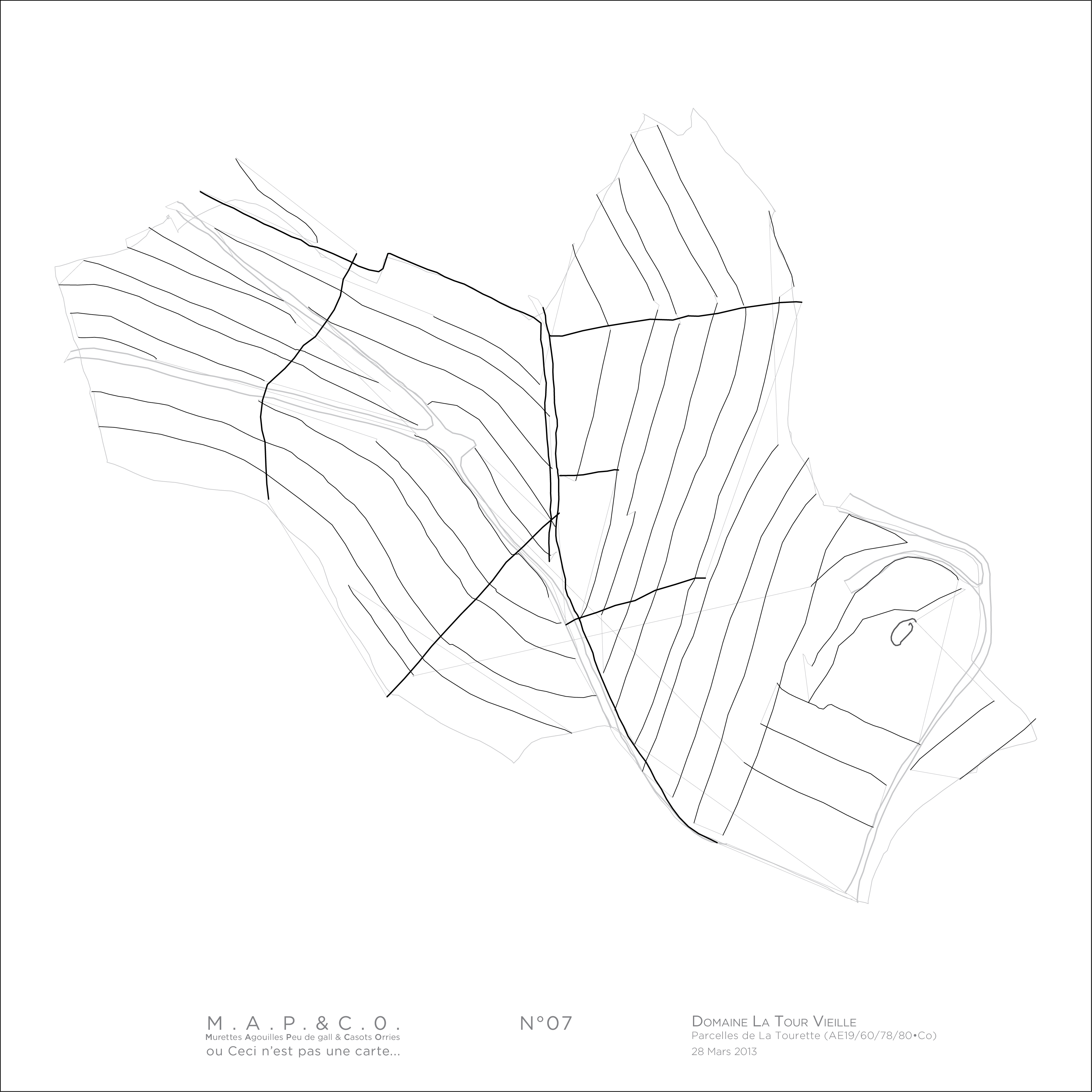 MAP&CO : Murettes Agouilles Peu de gall & Casots Orries ou Ceci n’est pas une carte est une série de dessins réalisés dans les vignes du terroir Banyuls-Collioure mettant en avant la structure des parcelles et leurs ouvrages architecturés en les parcourant.